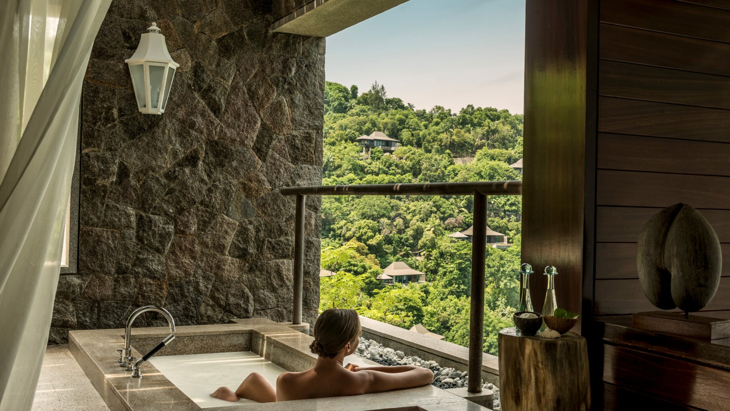 67 villas & suites intégrées dans le relief : lit king/queen, piscine à débordement, terrasse en bois, douche intérieure et extérieure, baignoire, minibar, Wi‑Fi, TV HD, coffre, service de ménage 2 fois/jour :