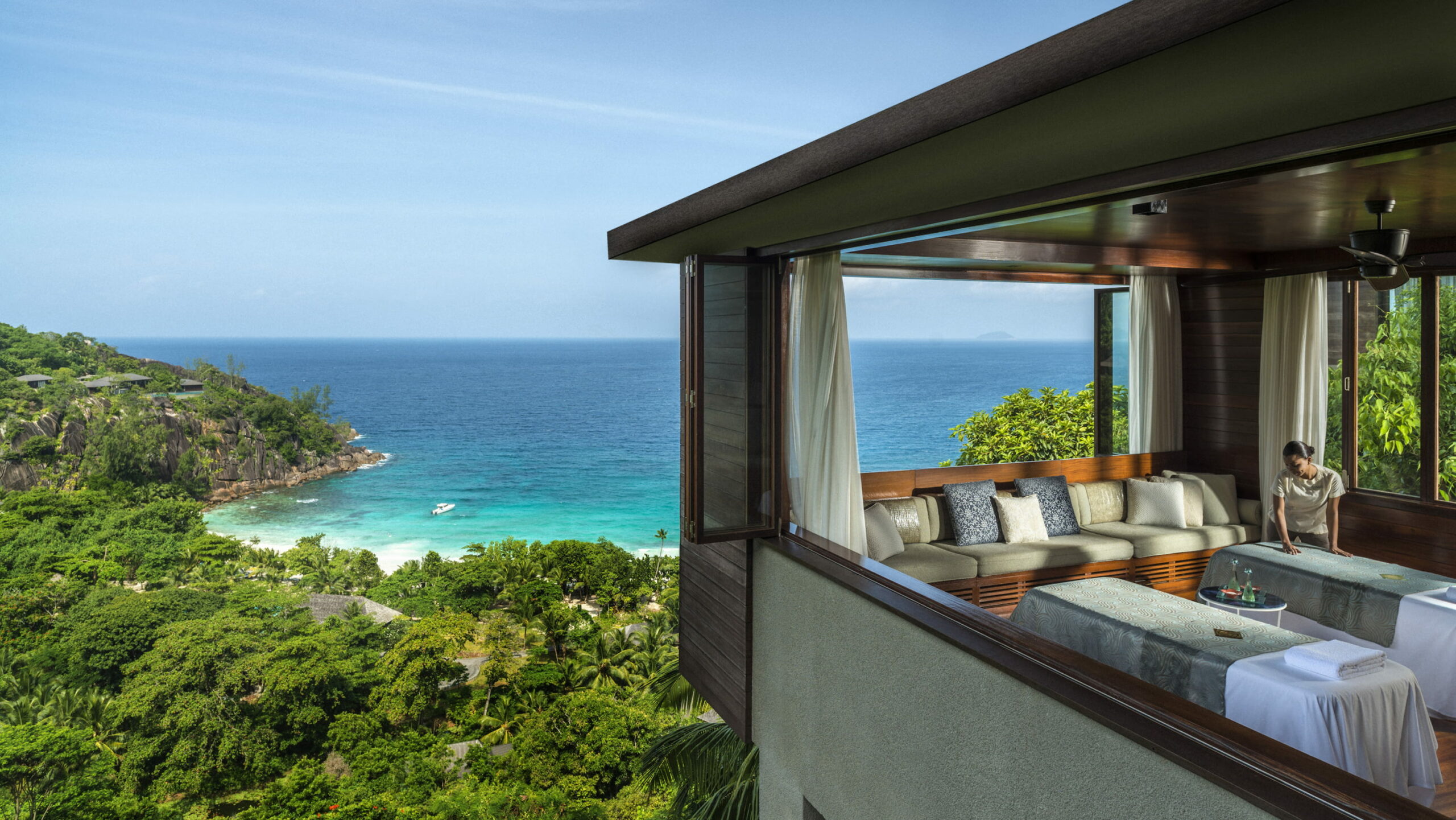 Sité dans la luxuriante Baie de Petite Anse, au sud-ouest de Mahé, bordée par une plage de sable blanc et des falaises granitiques