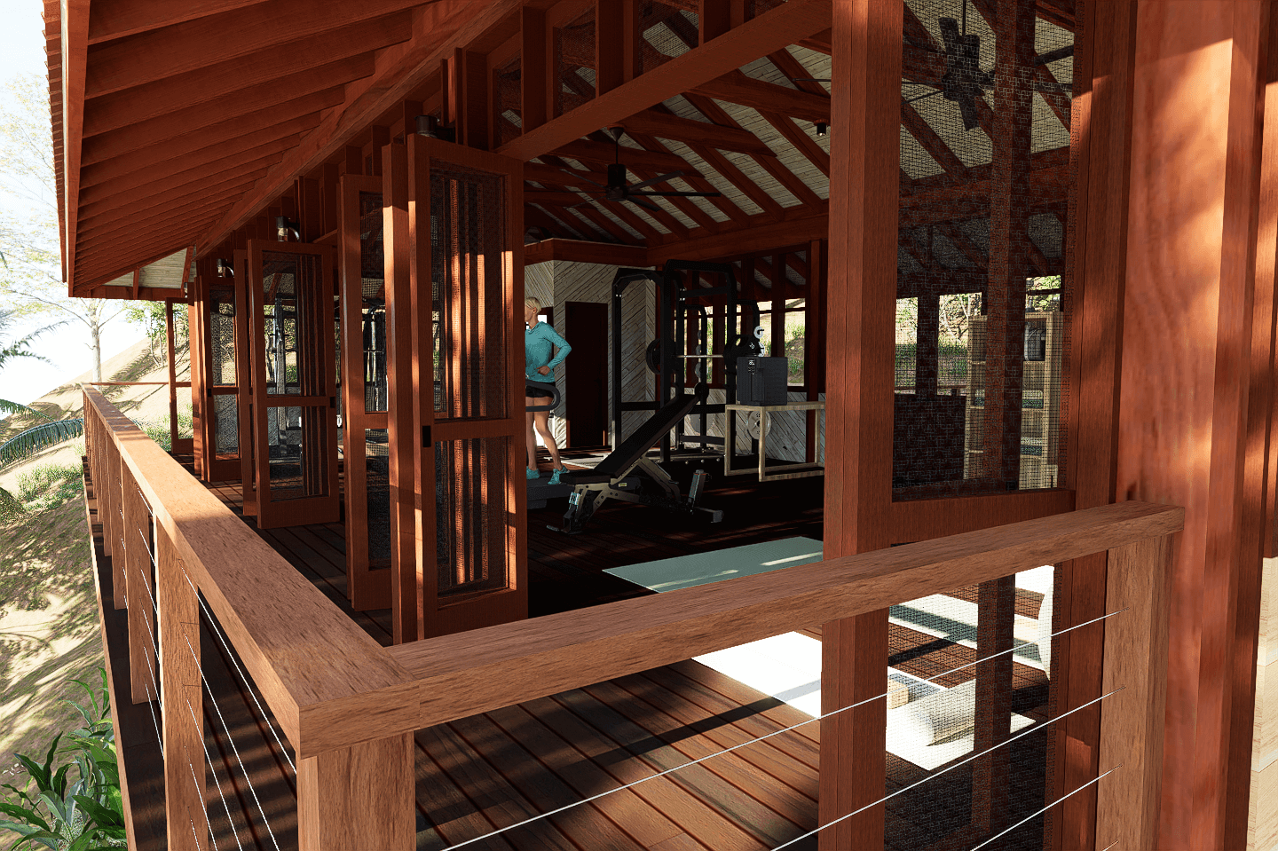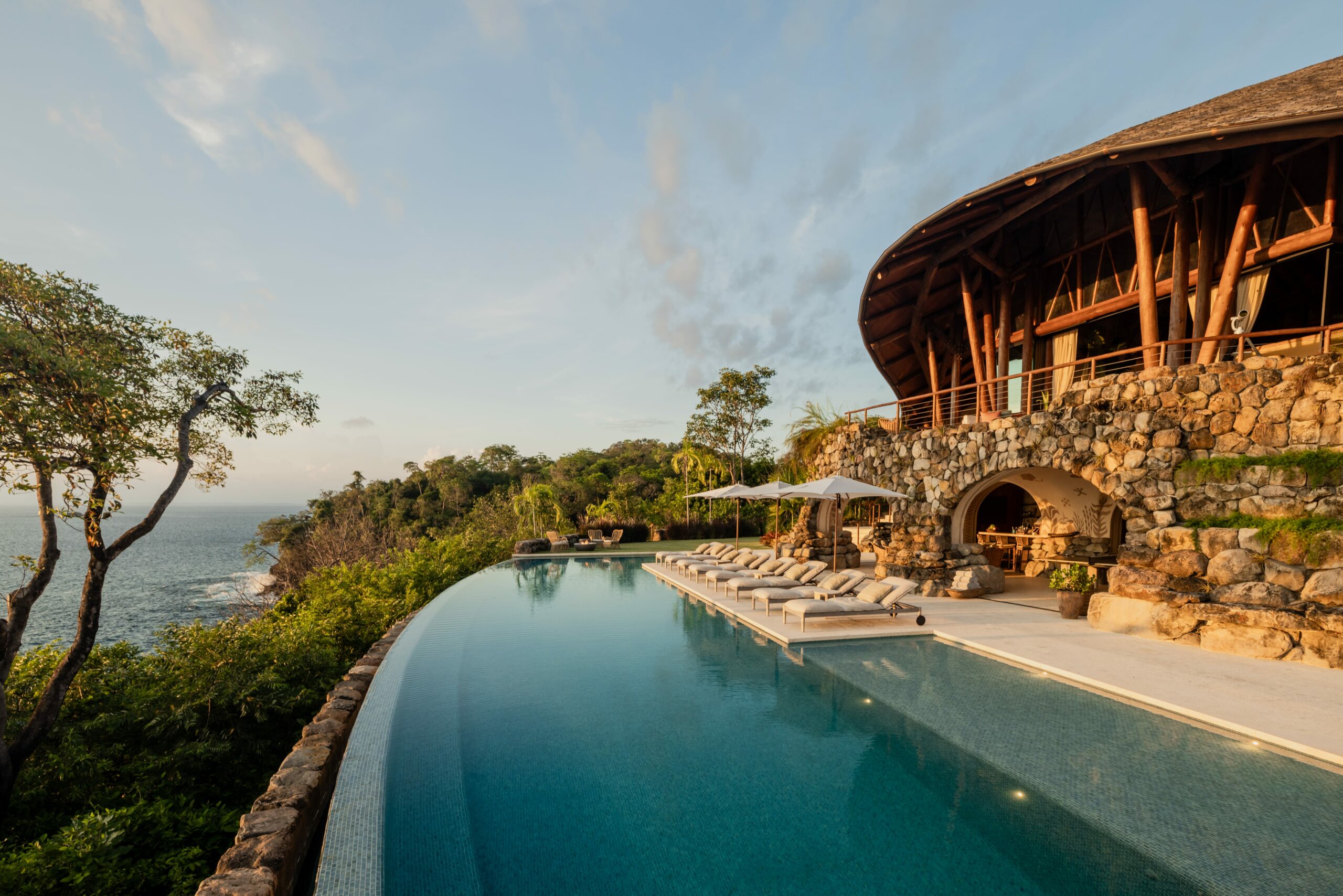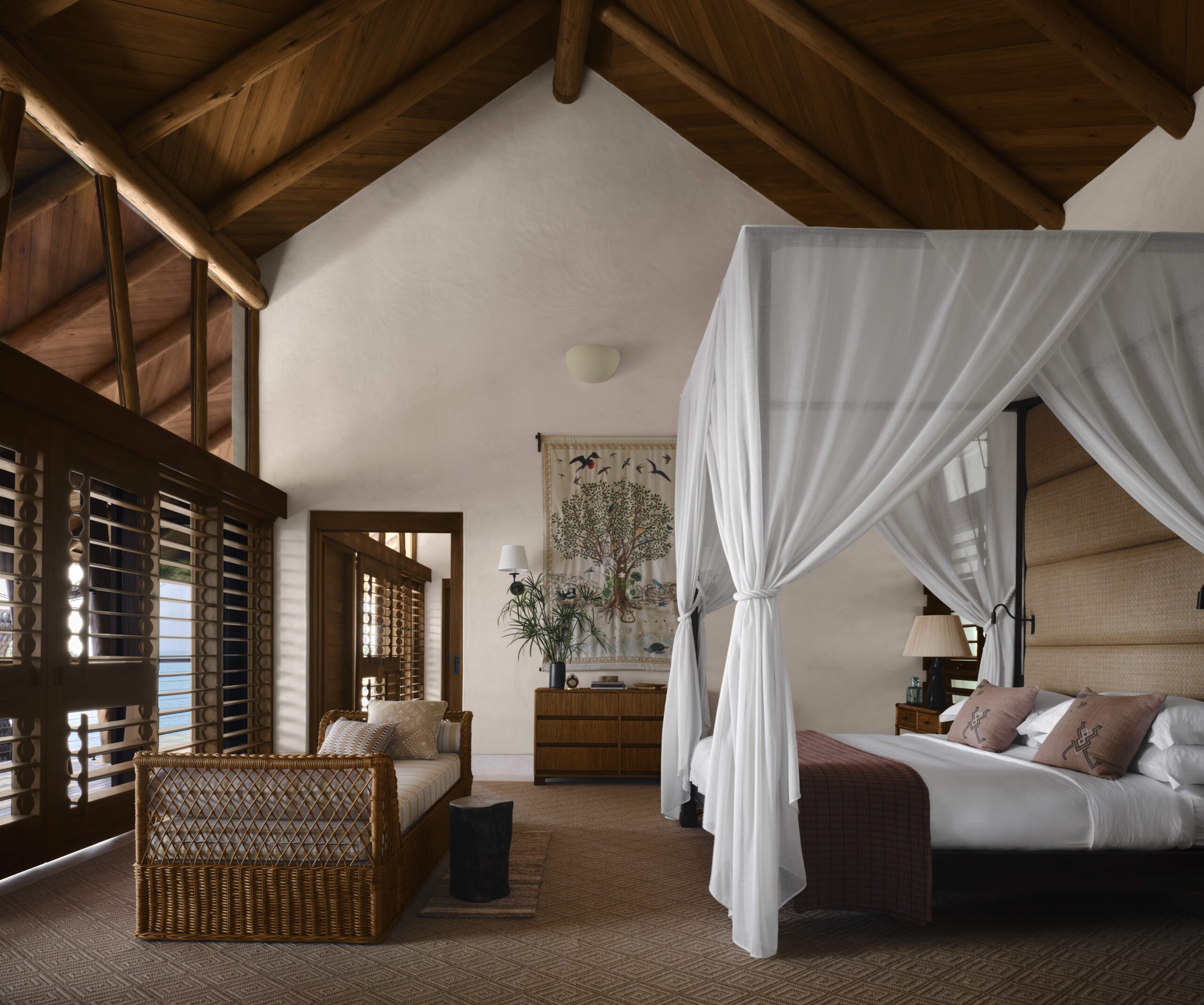 Espaces intérieurs-extérieur ouverts (terrasses, persiennes/panneaux coulissants), vue océanique, piscine privée, salle de bains partiellement extérieure/douches extérieures selon les cas, décoration élégante, matériaux naturels, ambiance luxueuse mais décontractée