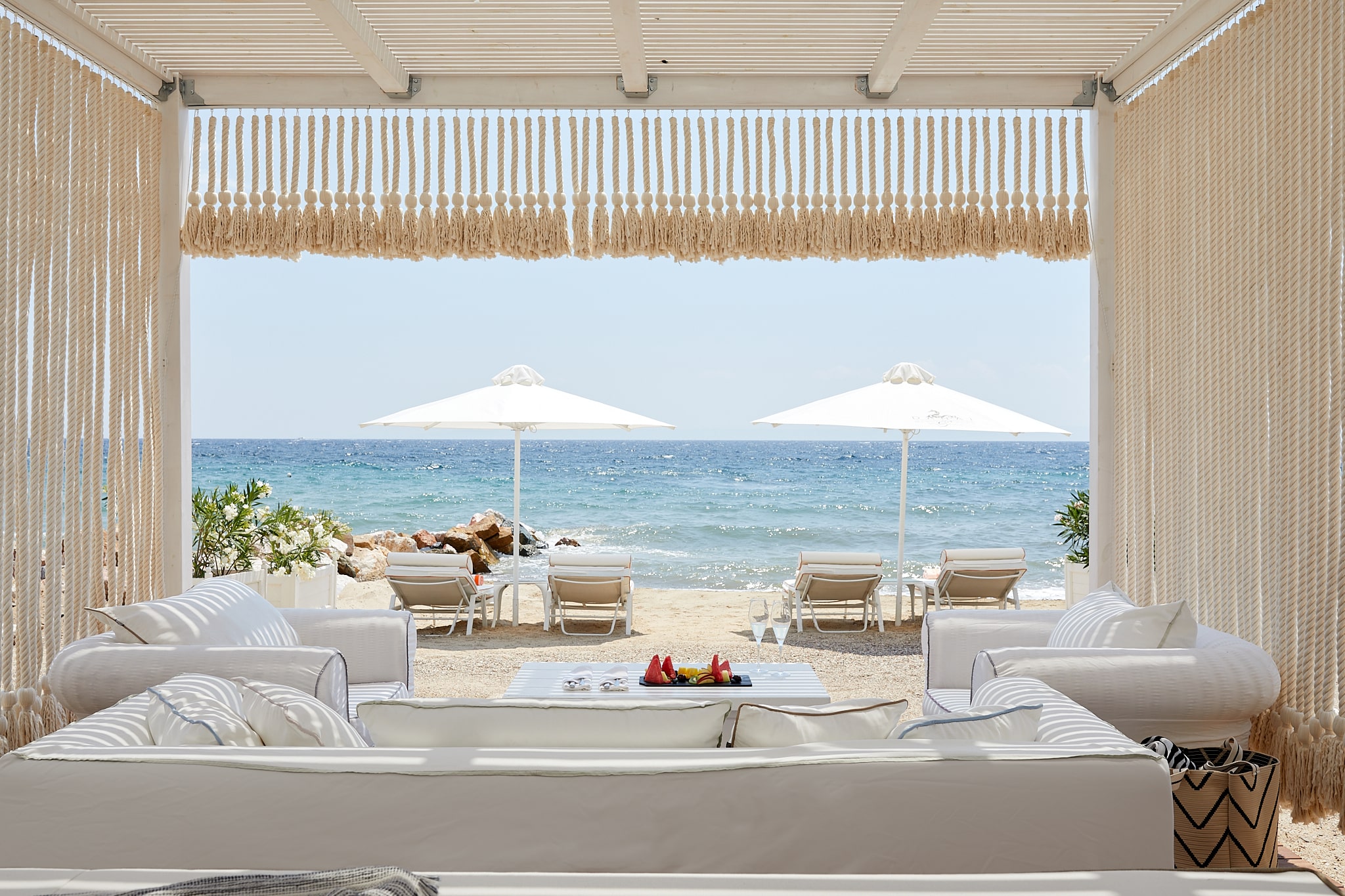 • Plage privée avec transats et parasols, cabanas et day‑beds réservables