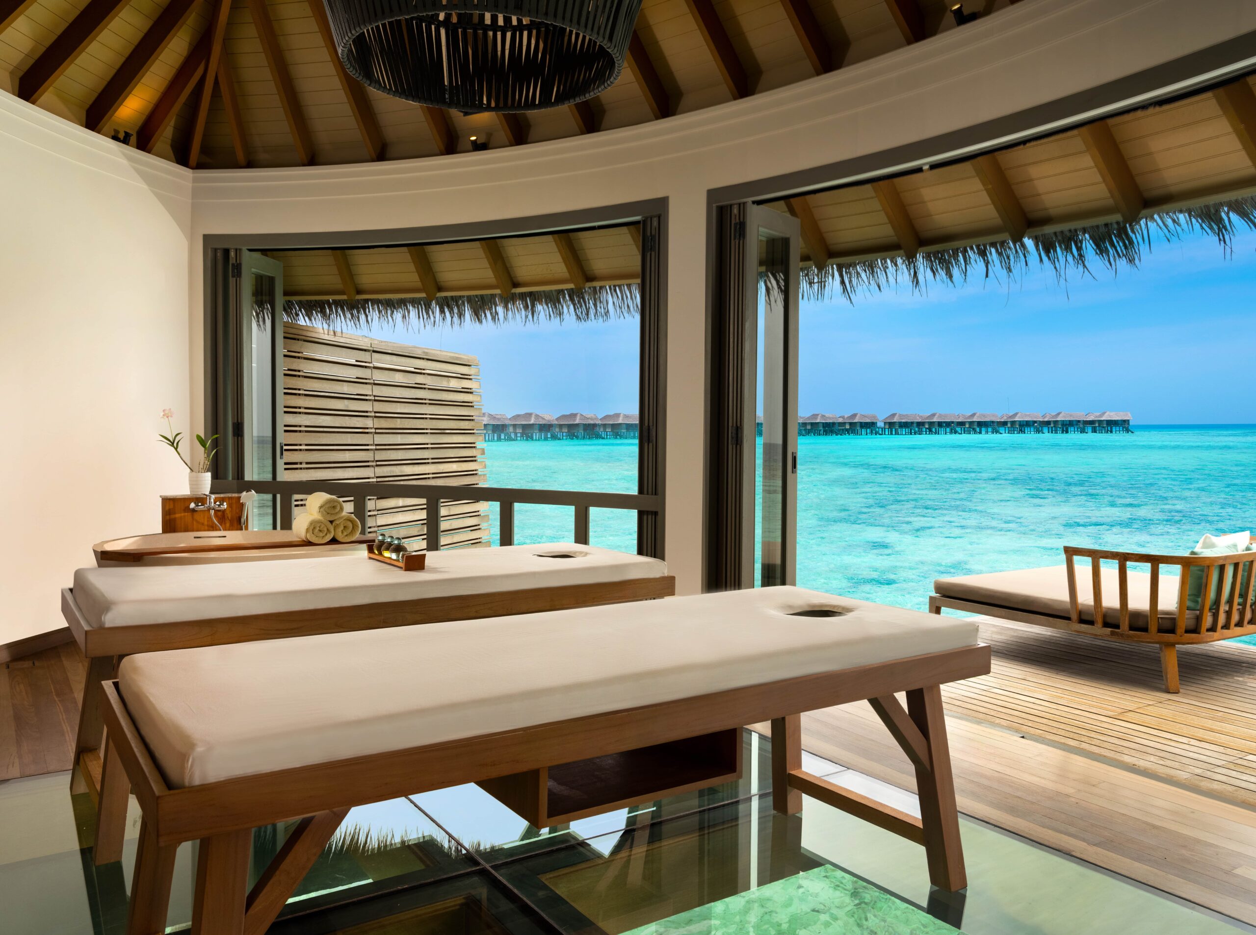 Bien-être & détente : spa sur pilotis au-dessus de l’eau, soins détente, massages, yoga, salle de sport, jardins tropicaux et espaces de relaxation
